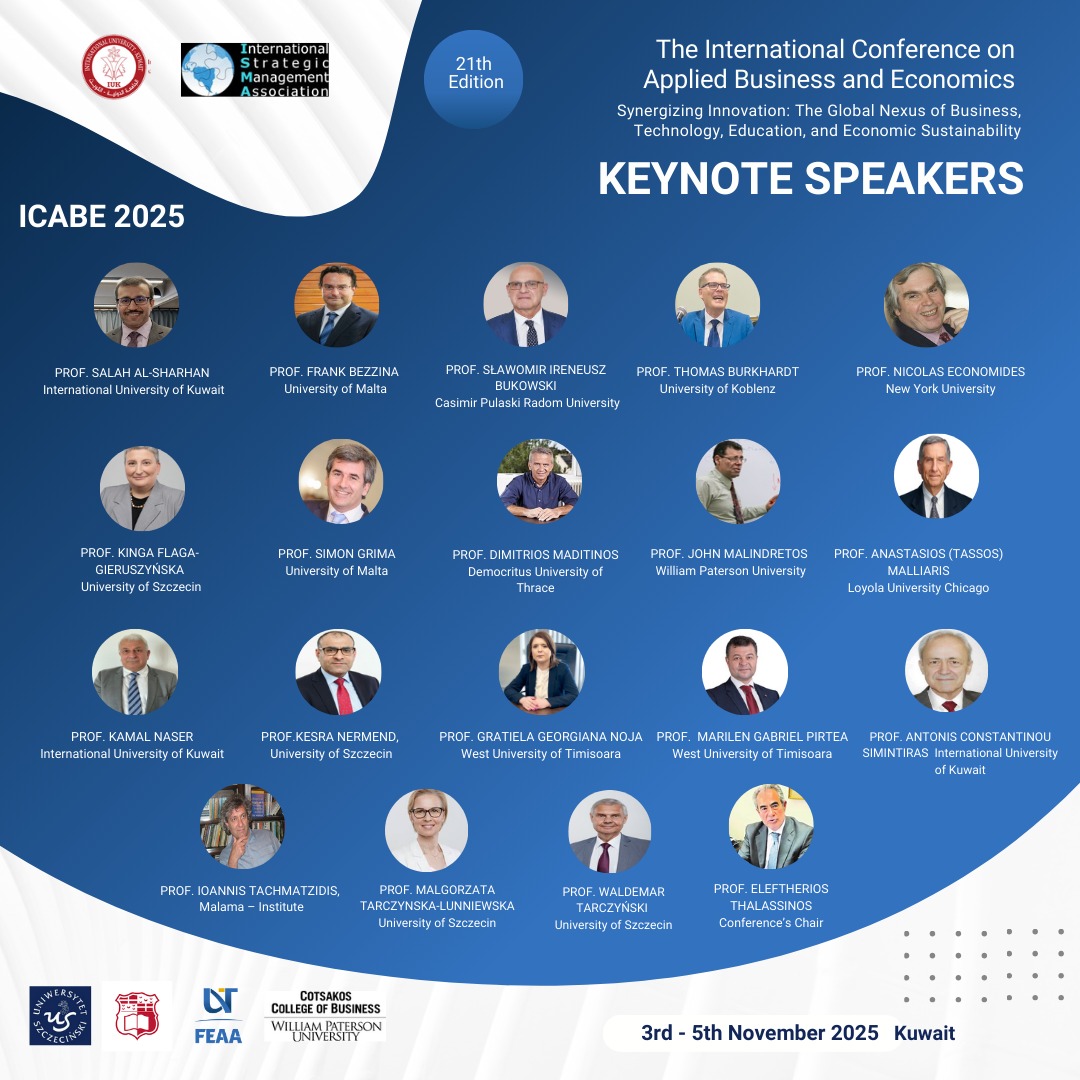 Join us in creating a transformative dialogue that bridges disciplines and catalyzes impactful change. We look forward to welcoming you to the 21st EDITION of the International Conference on Applied Business and Economics (ICABE 2025) in Kuwait City, November 3-5 2025! During the conference, there will be two special workshops: one on “Tips for Conducting Research Studies” and another on “Innovation and AI Applications in Future Education.” Both workshops are offered free of charge by the organizers; however, registration on the first day of the conference is required.
